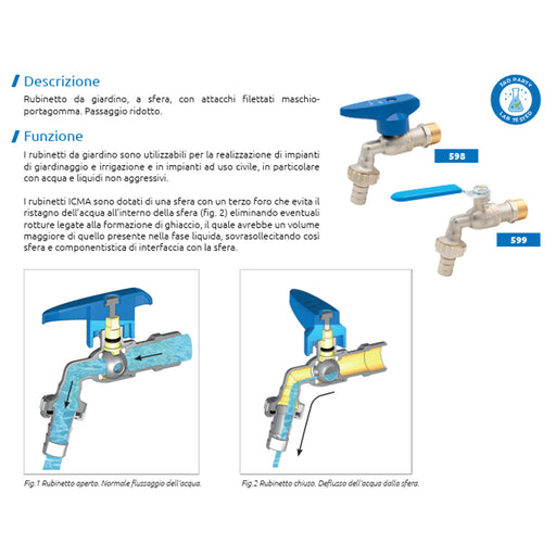 ICMARubinetto a sfera con portagomma da giardino leva corta Dettagli:Passaggio Ridotto, con sistema anti-ristagno dell'acqua. Attacco 1/2" M con portag...